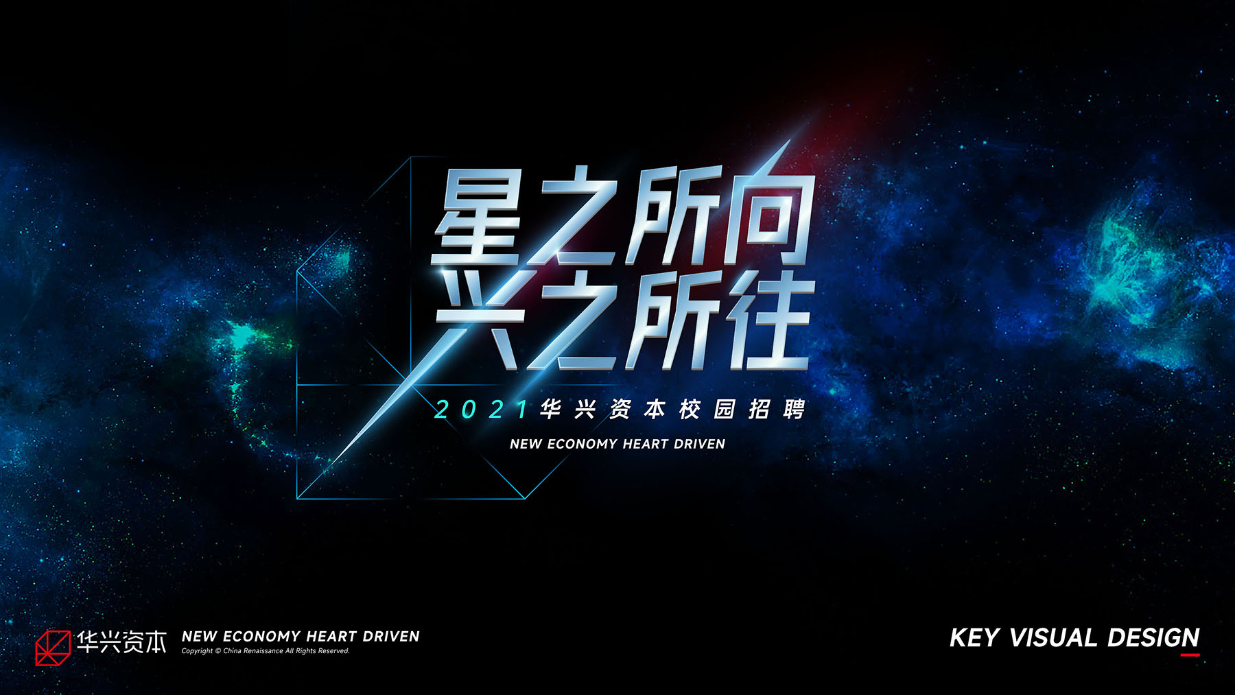 自2021年起,伙伴与华兴资本建立了品牌视觉合作伙伴关系。同年,伙伴为华兴资本校园招聘会,规划并设计了名为“星之所向,兴之所往”的主题KV。通过对slogan进行拆解,我们将logo、星光、未来作为本次设计的关键字。星代表着华兴资本想通过此次招聘会挖掘到未来之星,星光照耀之处便是华兴的未来所在。所以视觉上我们以光线作为主要的图形,通过光线的切割让整体画面锐而不利、熠熠生辉。一颗星的光芒毕竟是有限的,所以引入星河的概念来呈现出华兴未来的深邃与无限可能。浩瀚的星河里闪耀着无数星光,星光划过的地方融入华兴logo的线条图形,让整体充满未来感与科技感。字体的设计上将笔画与星光融合,棱角分明的光线感代表着品牌未来将一往无前,所向即所往。