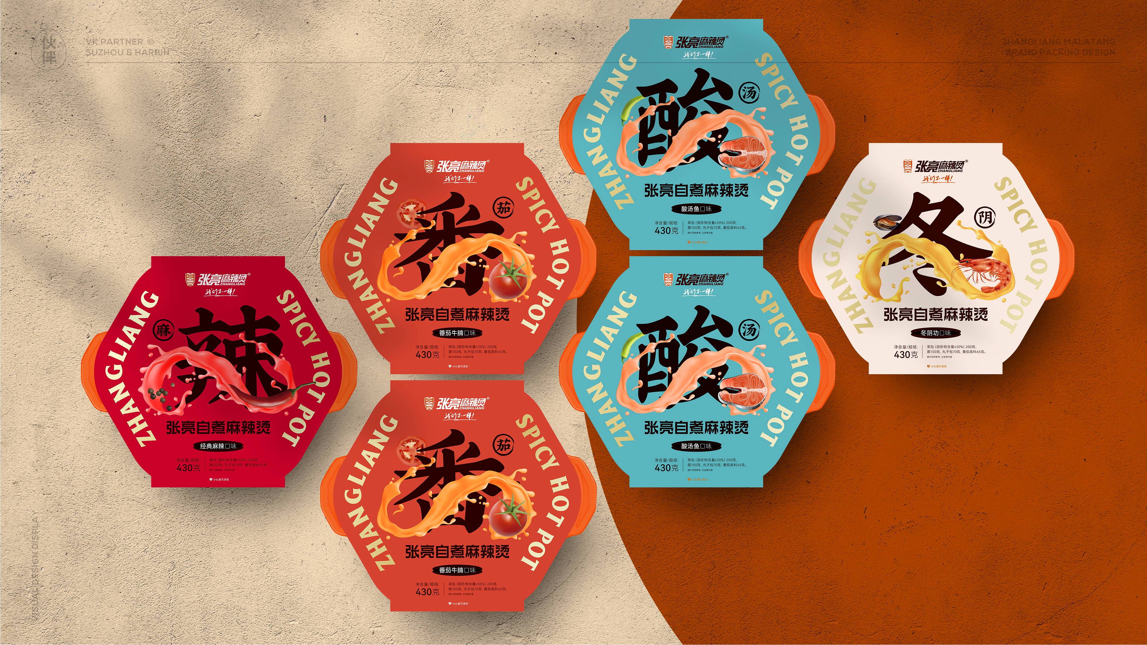 张亮自煮麻辣烫是张亮麻辣烫推出的方便自热即食类产品,首批次共有经典麻辣、番茄牛腩、酸汤鱼、冬阴功4个口味。伙伴为张亮麻辣烫这次推出的新产品进行了全新的包装规划与设计。