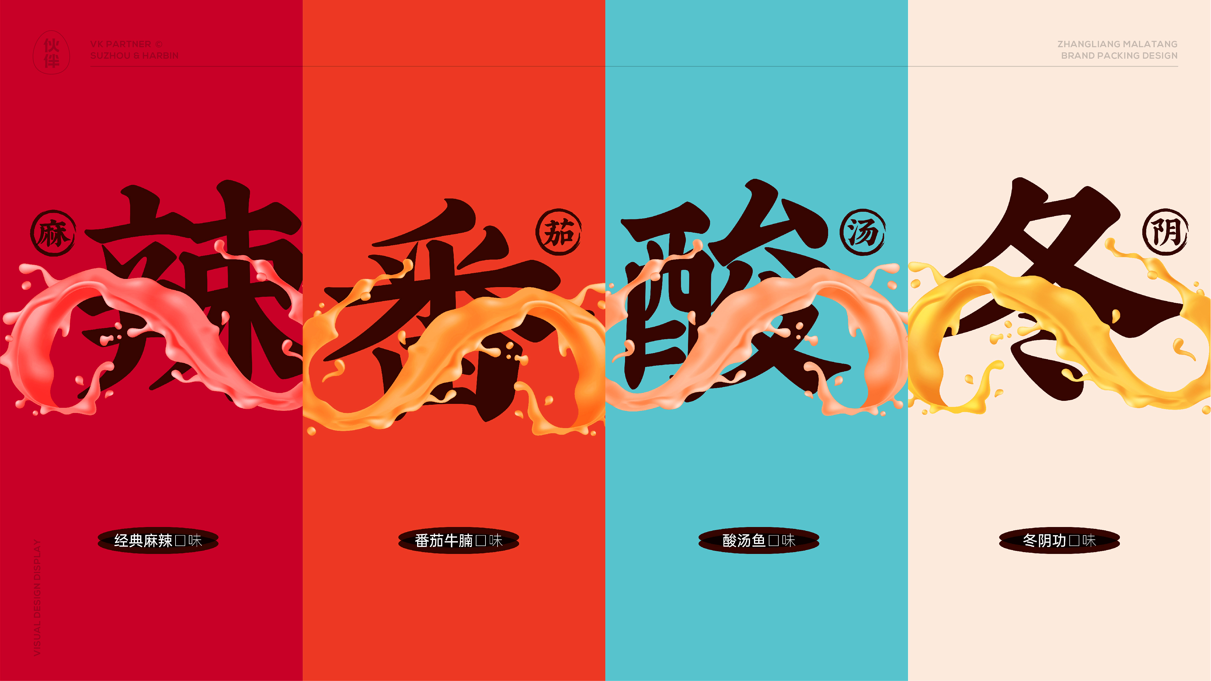 首先我们分别提取了四款产品的关键词,即:辣、番、酸、冬,来表达口味。之后以这四个文字作为核心进行了设计塑造,以飘逸、醒目的书法字体作为基体。在保证识别度的情况下,又加入相应的制作原料,使其整体展示更为直观。而且汤汁效果的融入,进一步强化了麻辣烫的爽快、火辣的特点。